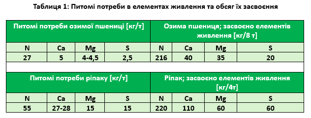 Звичайно, відповіді передбачають розуміння питання ЧОМУ? Тобто чому потрібно внести певну кількість поживних речовин, на якому етапі розвитку та яким саме продуктом (продуктами). Оскільки мета й можливість підживлення полягає насамперед у поповненні макроелементів (за винятком фосфору та калію), ми обмежимося розглядом саме цих елементів. Хорошою відправною точкою для визначення норми внесення є питомі потреби культури (табл. 1).