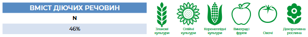 Переваги продукту: Найбільш концентроване азотне добриво. Завдяки амідній формі азоту його вивільнення відбувається повільніше, тому він здатен забезпечувати рослини азотом протягом тривалішого часу. Повністю розчиняється у воді.